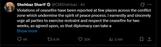 Οι ιρανικές δυνάμεις συνέχισαν να βομβαρδίζουν τα κράτη του Κόλπου μετά την ανακοίνωση της κατάπαυσης του πυρός, υπογραμμίζοντας την ευθραυστότητα της εκκολαπτόμενης εκεχειρίας, ενώ ο πρωθυπουργός του Πακιστάν, Σεχμπάζ Σαρίφ, έγραψε στο X ότι «οι παραβιάσεις της κατάπαυσης του πυρός» υπονομεύουν τη διπλωματική διαδικασία.